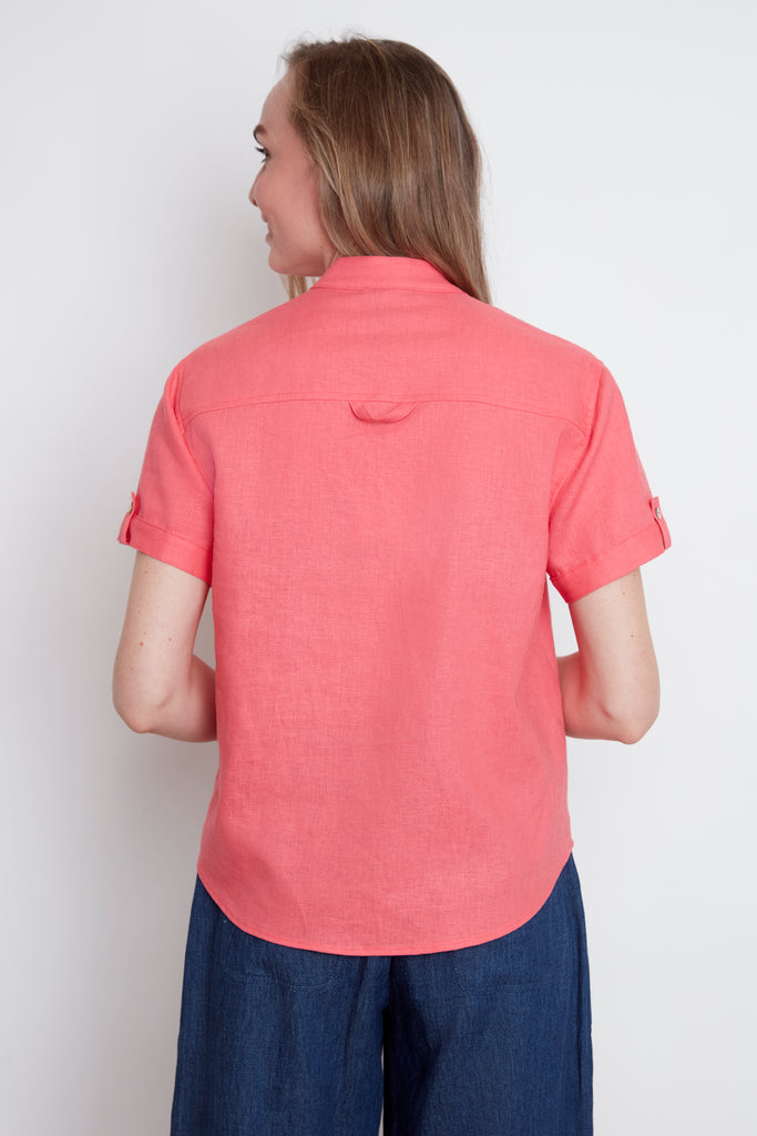 Voici notre nouvelle chemise Jasmine de l’été en lin et tencel. Elle a un joli encolure mao et un détail de poche piquée sur la poitrine . Elle est versatile et casual chic portée sur un denim style toxedo canadien ou en accent sur un chino en lin!
